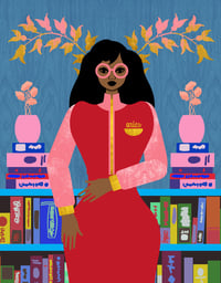 In this print, Aries ready for her next sports event. She is dressed in red and pink athletic gear and "Aries" is embroidered on her jacket. She filled her room with tons of book and plants. (An, an Aries "ram" symbol hiding in plain sight).