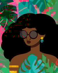 In this print, Eva vacations in the tropics. She wears her natural hair big and beautiful. Her fashionable sunglasses match with her gold earrings and armband.