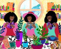 In this print, a trio of bookworms sit in their library and read. They are surrounded by shelves of books and a table covered in plants.